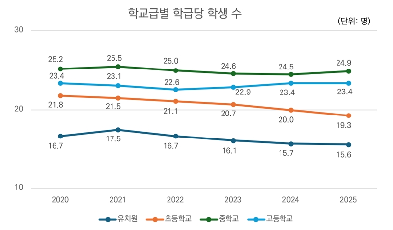 학급당 학생 수는 유치원 15.6명, 초교 19.3명, 중학교 24.9명, 고교 23.4명으로 집계됐다. 전년 대비 유치원은 0.1명, 초교는 0.7명 감소했다.