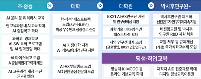 이번 방안은 ▲생애주기별 AI 기본교육 강화 ▲지역 기반 인재양성 체계 구축 ▲우수 인재 조기 양성과 성장경로 마련 ▲산업‧학문 전반의 융합인재 양성 ▲기업-대학 공동 인재양성 활성화 등 다섯 축으로 구성됐다.