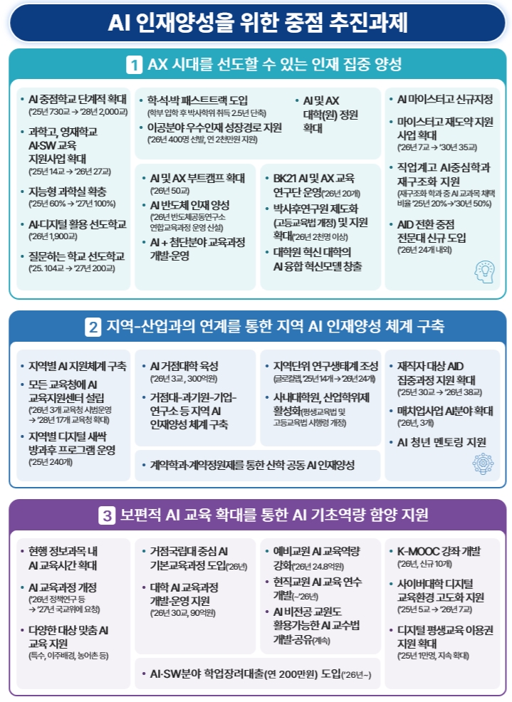교육부는 수도권 중심의 AI 교육 불균형을 해소하기 위해 2026년 3개 거점국립대를 ‘AI 거점대학’으로 지정한다. 이 대학들은 GPU 등 인프라를 확보해 지역 산업과 연계한 AI 전문 학과를 중심으로 교육과 연구를 수행한다. 또한 시‧도 교육청에는 ‘AI 교육지원센터’를 2028년까지 전면 설치해 학생·학부모 대상 AI 기초교육을 지원한다.